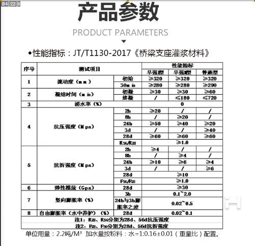 3、無收縮、粘結強度高: 具有微膨脹,與鋼筋有很好的握裹力。確保地腳螺栓和機座(鋼結構)基礎以及新老混凝土牢固結合。